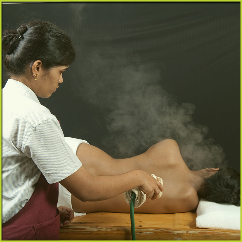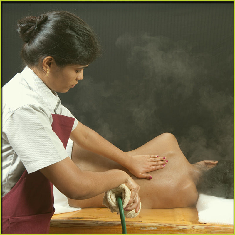 After oil massage steam is given to a particular part of the body through the tube | pain and stiffness.
